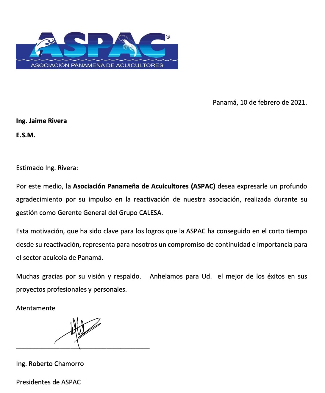 En días pasados, Grupo Calesa informó la salida de su Gerente General, Jaime Rivera. La ASPAC aprovecha esta oportunidad para agradecer la confianza y los esfuerzos de Jaime por reactivar e impulsar las actividades de nuestra asociación. Una carta de agradecimiento ha sido entregada por tal motivo, y para muestra pública de nuestro agradecimiento y expresión de nuestros mejores deseos, la publicamos aquí.